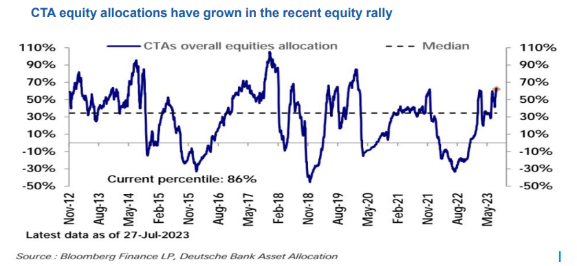 According to Deutsche Bank, those systematic equity funds (quants) and CTAs (commodity trading advisors) may have taken too many sips of the spiked Koolaide because they went net long in their allocations (up to the 86th percentile). As you can see in the chart below, they have been higher, but just as they build up long positions, these fast traders will sell. If we see further downside pressure on the S&P 500 and a continuation of realized volatility, we could see a sharp correction in stock prices as these fast traders switch their positioning.