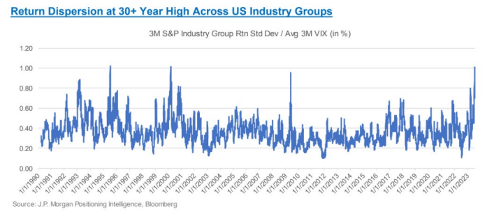 While solid performance in the S&P 500 has dominated recent headlines, there is an even more substantial shift in performance taking place at the industry and sector level. Hot sectors include communication services, information technology, and consumer discretionary. Sectors that have lagged are interest rate sensitive, like real estate and utilities. These massive differences in performance YTD are like a spread office; this dispersion is near a 30-year high. We believe in mean reversion strategies and think utilities could outperform at the end of the Fed’s tightening cycle. Utilities in states that continue to see migration (Texas, Florida, Carolina, and Tennessee) benefit from more significant retail and commercial consumer bases.
