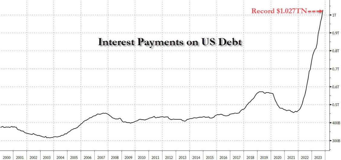 As lawmakers continue to ignore the horror show that is the US budget, the US has now hit an interesting delta as US debt interest payments just hit one trillion dollars.